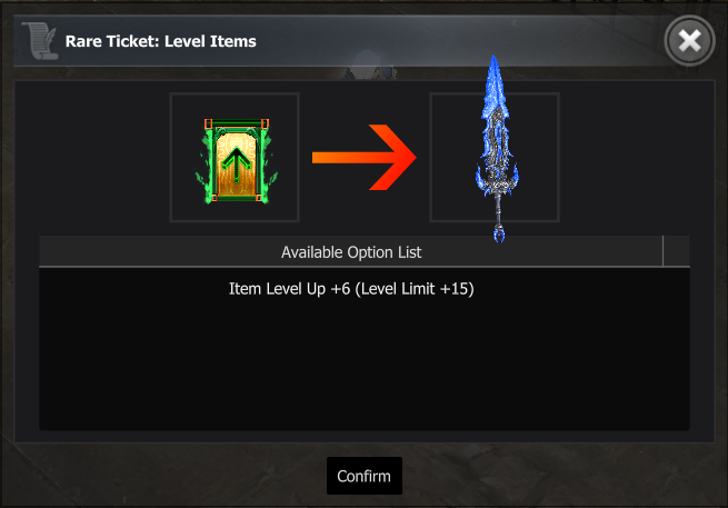 Allows evolving an item of any category (as long as it's compatible) by up to +6 levels; | Rules for Earring Pair (left and right) and Mounts: Rule 1 (+0 to +13): Mounts or Earring Pair with level between +0 to +13: 1x Rare Ticket: Level adds +3 levels. Rule 2 (+13 to +14): Mounts or Earring Pair from level +13 to +14: 1x Rare Ticket: Level adds +1 level. Rule 3 (+14 to +15): Mounts or Earring Pair from level +14 to +15: 1x Rare Ticket: Level adds +1 level. Example: If you own an Earring Pair (left and right) or Mount at level +0 and want to enhance them to level +15, the process will be as follows: To reach level +13, you will need 5x Rare Ticket: Level (each Rare Ticket: Level increases +3 levels: +0 > +3, +3 > +6, +6 > +9, +9 > +12, +12 > +13); To reach level +14, you will need 1x Rare Ticket: Level; To reach level +15, you will need 1x Rare Ticket: Level; |